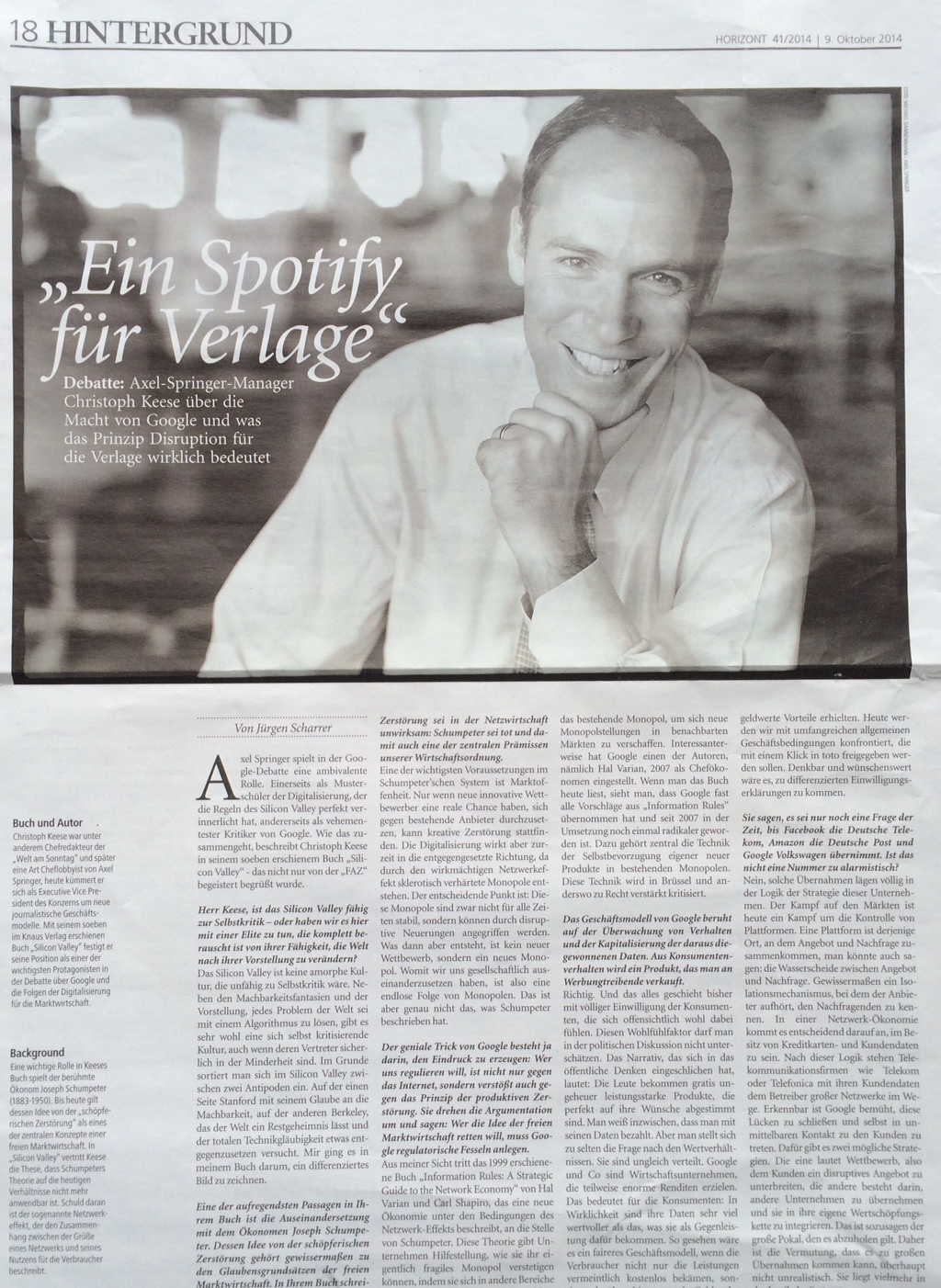 In der jüngsten Ausgabe von „Horizont“ hat Chefredakteur Jürgen Scharrer mich zum Thema Silicon Valley und den Folgen befragt. Mit freundlicher Genehmigung des Verlags hier der Wortlaut des Interviews: