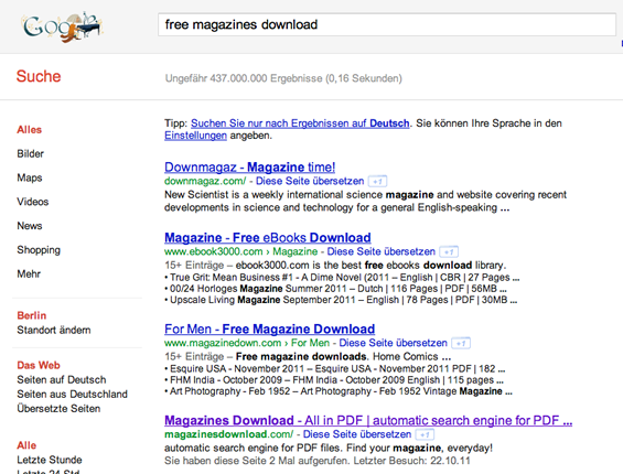 Google mischt natürlich fleißig mit und wirft beim Suchwort „Free magazines download“ ein Verzeichnis aller einschlägigen Seiten aus. Interessant, dass Google selbst klare Straftaten nicht als Suchwort sperrt oder zumindest eine unverfängliche Liste unter Streichung der illegalen Anbieter anzeigt. Die Begründung ist klar: Google indexiert ja nur, was im Web stattfindet. Mit den Eigentumsdelikten der angezeigten Seiten hat Google nichts zu tun, wird Google sagen, wenn man danach fragt.