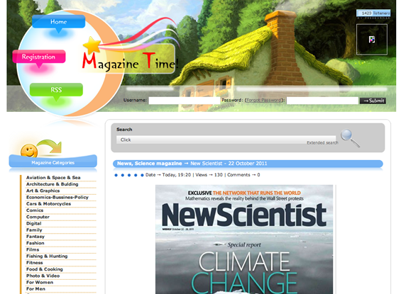 Magazines Download ist nicht allein. Es gibt Dutzender solcher Seiten, und alle sind leicht mit Google auffindbar. Hier zum Beispiel die Homepage von Magazine Time. Das Modell funktioniert exakt gleich. Im Hauptangebot steht gerade der New Scientist: